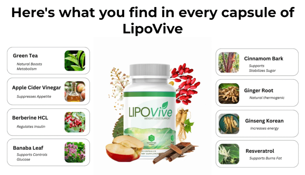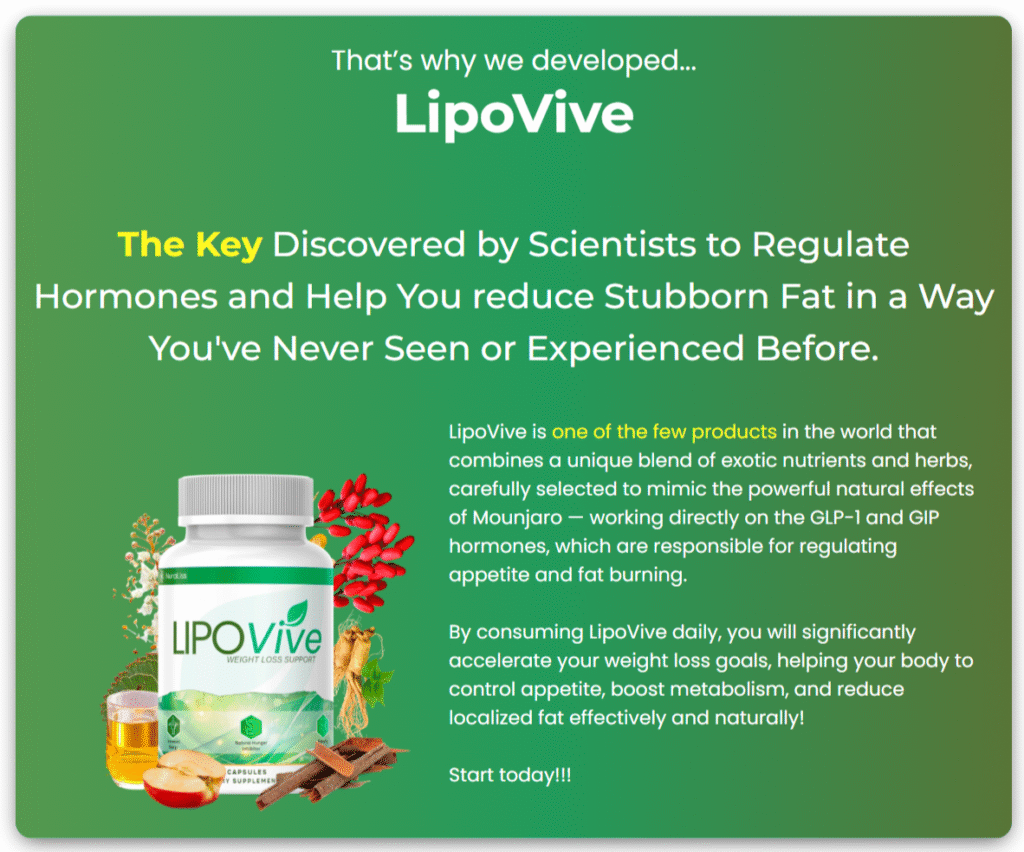 LipoVive is designed to promote natural and safe weight loss. By boosting metabolism, it helps the body burn fat more efficiently. With powerful ingredients like Garcinia Cambogia and Green Tea Extract, LipoVive not only reduces fat production but also stimulates fat breakdown. This enables you to achieve a more sculpted silhouette without restrictive diets or intense workouts.